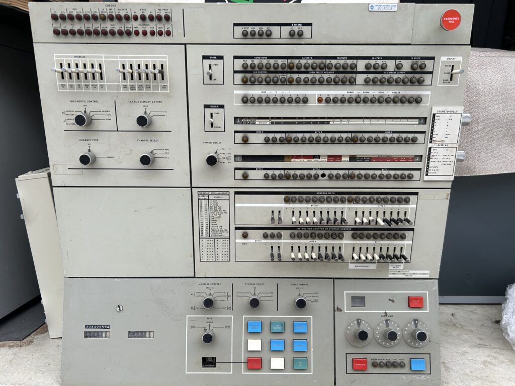 Here is something we never expected to have, a complete console from the legendary IBM System 360 model 40 mainframe! This console is in excellent condition, and appears to have been built in 1967. The IBM 360 family of mainframes was one of IBM’s most successful product lines, and the impact continues today in current generation Z-series mainframes that power some of the worlds largest banks and other businesses. We were fortunate to collect his locally along with some other boards and parts that were headed for scrap. This console appears to have once been owned by a local bank, called Virginia National Bank, based on the asset tag.